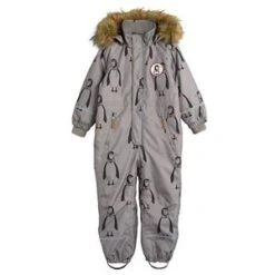 Mini RodiniKids Mini Rodini Baby Kebnekaise Snowsuit With All Over Penguin Print – Grey