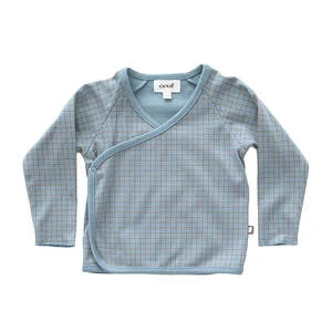 – Oeuf pima cotton jersey wrap top with side tie closure, all over blue check print and long raglan sleeves