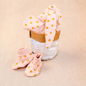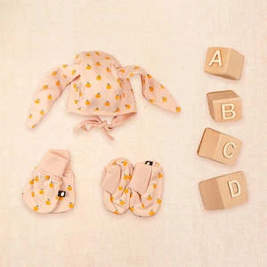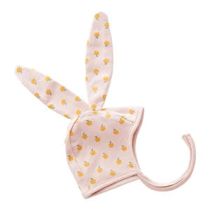 – Oeuf pima cotton jersey bonnet with all over pink apple print, bunny ears and tie closure