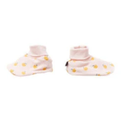 – Oeuf pima cotton jersey sock booties with all over pink apple print and ribbed fold-over ankle cuffs