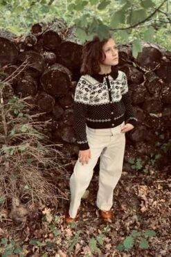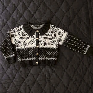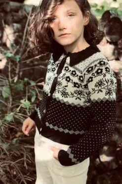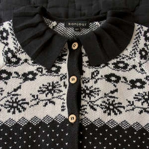 From Bonjour’s new Autumn/Winter 2022 collection. Slim fit black and ivory knit cardigan sweater with pleated collar, floral and heart jacquard.