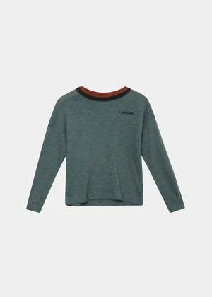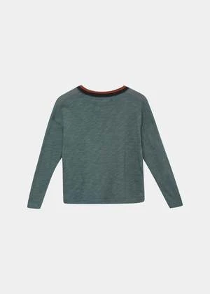 Our Vibernum T-shirt in Aegean blue jersey. In a rich flecked shade, with a contrasting double-striped crew neck collar and logo lettering inspired by vintage sportswear. Long sleeved and extra soft. 100% cotton slub.