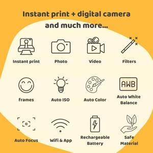 – EASY WIRELESS TRANSFER: Connect your phone to this camera wirelessly and print any picture saved in your phone album. Saving camera photos to phone is also only a few taps away. Get access to 200+ photo frames, stickers, coloring photos, puzzles. Create your own banner message and print it out, or doodle & print. This innovative camera is the best memory-making companion.