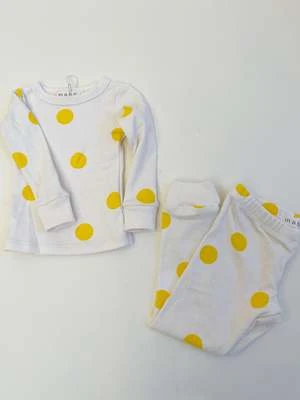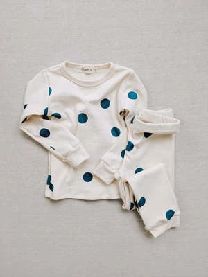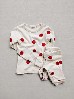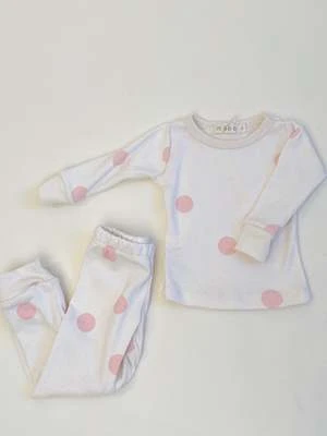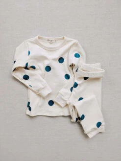cozy long sleeve pajamas in natural organic cotton printed with water-based ink in a sweet polka dot pattern.