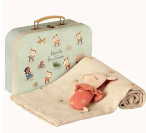 This beautiful gift set includes a Bambi rattle and a soft knitted blanket, both in OEKOTEX Cotton. It is packed in a nicely decorated, handmade suitcase.