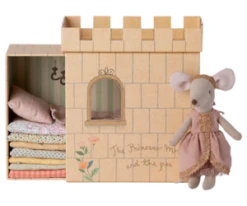 Become enchanted with the newest Maileg take on the Princess and the Pea! This Princess, who wears an stunning sparkle dress, comes in a keepsake castle box that slides open and closed. Just like in the story, the princess mouse still feels the pea even with the many mattresses that come in this cute set… how charming!