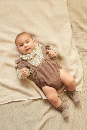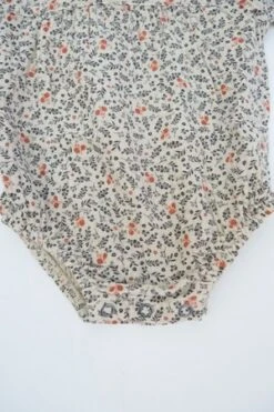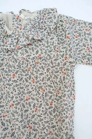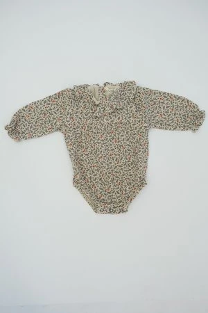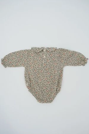 Buttons at back, ruffle collar, snaps for easy diaper changes