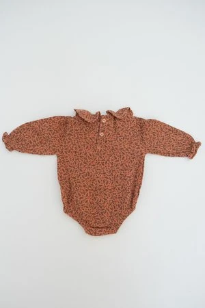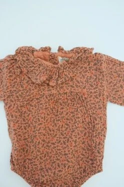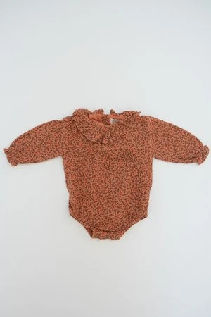 Buttons at back, ruffle collar, snaps for easy diaper changes