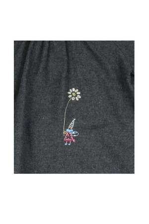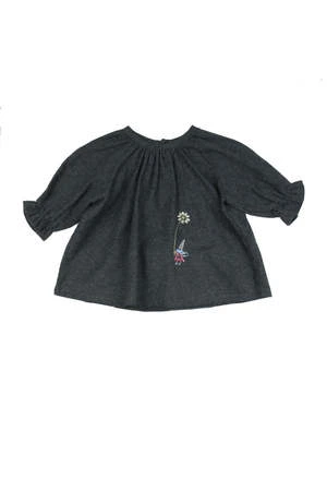This Chambray Top is made with 100% cotton. Features a hand embroidered pixie graphic at the front. Finished with gathered neck, ruffled sleeves, and mother pearl button back closure. Pair it with matching Chambray Ruffle pants to complete the set.