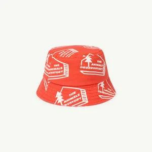 New from the Animals Observatory. Red baby bucket hat with allover tree and logo house print.
