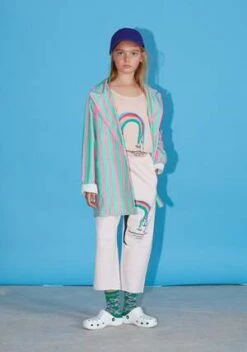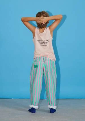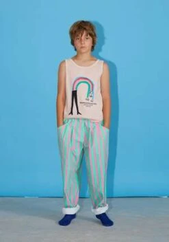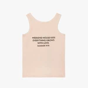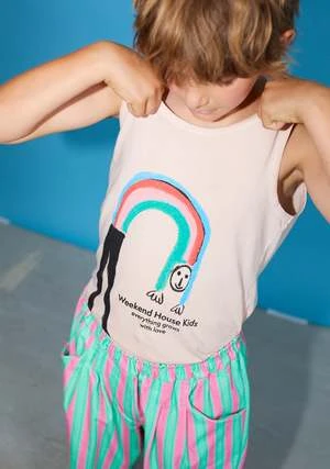 New from Weekend House Kids ‘Everything Grows With Love’ collection for Spring/Summer 2022. Kid’s organic cotton tank in a soft dusty pink featuring rainbow person graphic on front.